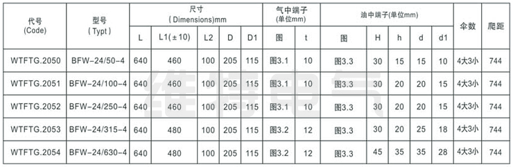 B-變壓器用;D-單體瓷絕緣;F-復合瓷絕緣;J-有附加絕緣:W-防污;L-穿纜(或可裝電流互感器),套管型號中“廣前 的數字表示額定電壓(KV ) 后的數字表示額定電流(A)。