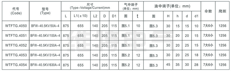 B-變壓器用;D-單體瓷絕緣;F-復合瓷絕緣;J-有附加絕緣:W-防污;L-穿纜(或可裝電流互感器),套管型號中“廣前 的數字表示額定電壓(KV ) 后的數字表示額定電流(A)。
